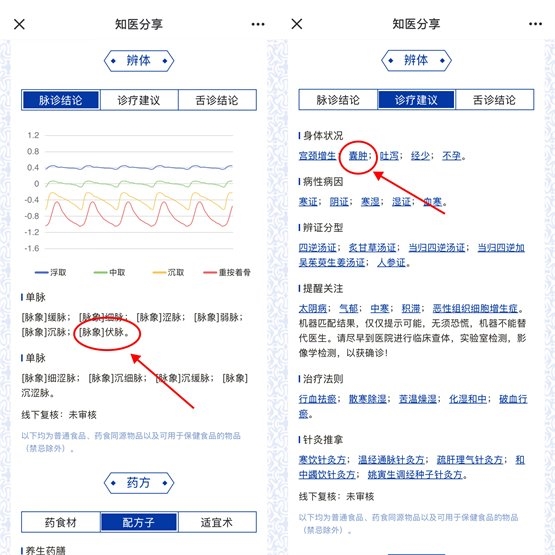 (王女士體驗(yàn)ChatiSS后,系統(tǒng)根據(jù)其舌脈信息,提示身體狀態(tài)可能有“囊腫”)
